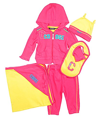 Coogi "Coogi University", Give your little girl the cute and chic style of Coogi with this adorable 5-piece layette set. All items are made of the softest materials for the utmost comfort. Includes: Hoodie: full zip, collegiate logo chest graphic, ruffled cuffs, split kangaroo pocket, ribbed hem. Sweatpants: elastic waistband and cuffs, surged stitching highlights on legs. Bib: Velcro closure, contrast trim, embroidered collegiate logo applique. Cap: knot accents, surged stitching highlights on foldover cuff. Receiving B