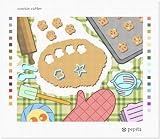 Stitch up a fresh batch of sugar cookies with this wonderful canvas. Shown are cookie dough, a bunch of cut cookies lined up nicely on a baking pan, various baking tools, a padded glove, all against a pretty patterned tablecloth.